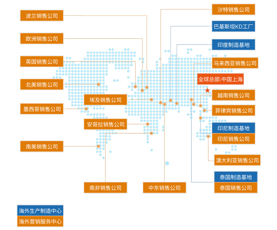 通过广泛合作,上汽成为国内首家“全产业链出海”的汽车企业,目前在海外构建了包括创新研发中心、生产基地、营销中心、供应链中心及金融公司在内的汽车产业全价值链,产品和服务进入全球100多个国家和地区;在海外拥有3大创新研发中心、3座整车制造基地和1座KD工厂、100多个零部件生产研发基地和3000多个营销服务网点;并在印尼建立首家海外金融服务公司,为当地经销商及终端消费者提供全面的汽车金融贷款及保险服务。