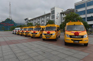 Chinese car-maker SAIC Motor, together with Shanghai Tobacco Group Co, donated six school buses and two ambulances to Enshi city in Hubei province on May 4, 2017.